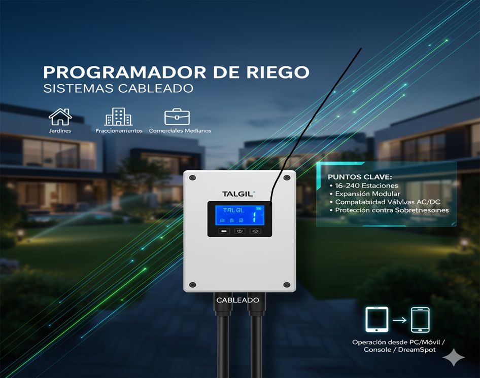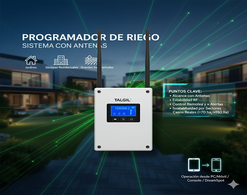 Controlador de riego automatico avanzado para riego por goteo y aspersión. Compatible con múltiples sensores y sistemas de fertirrigación.